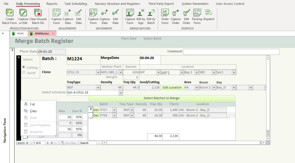 There are a number of reasons why you would want to merge batches at some stage in the process. In NIMS it is easy to achieve and NIMS controls merging so that you don’t end up with mixed clones etc. NIMS also allows you to set age tolerances for merges. Below are the steps for performing a merge.