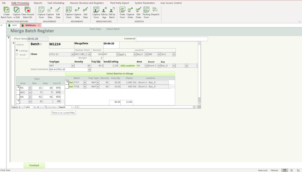 Once you have captured all your proposed merge batches, it is time to print the form. The form then goes out into the nursery and records any adjustments that need to be made either prior to the batch being merges into the new batch, or adjustments to the now merged batch that need to be taken into account.