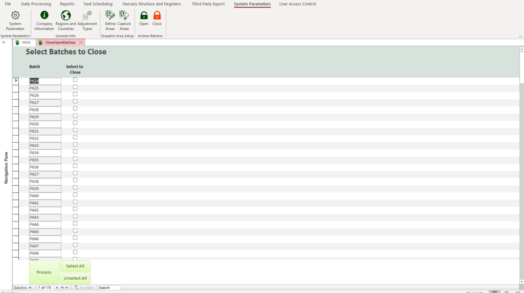 batches option, NIMS will list all batches which can be closed. These would be batches with a zero balance that are not marked as archived.