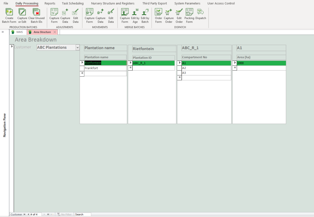 NIMS allows you to setup an advanced delivery area based on plantation areas. Just like the Nursery structure the dispatch area structure allows for setting up a 4 tiered delivery structure. However sometimes you require additional information such as plantation sizes. In this example we use the 4th level to describe how this can be done.