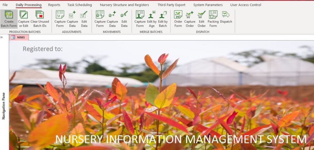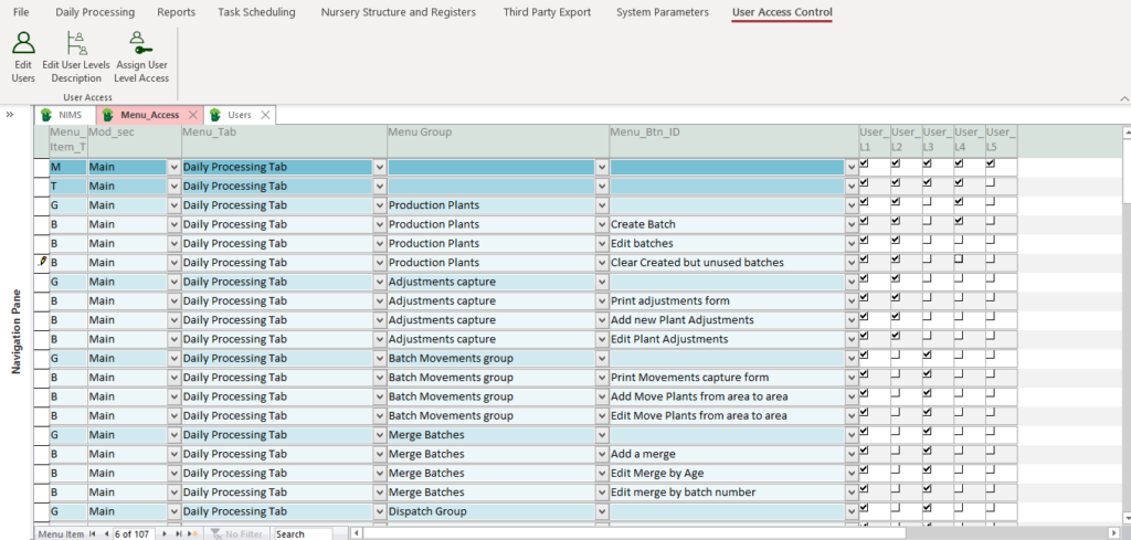 In our example we have removed the ability in level 2 to process batch movements and merges as well as access to dispatch. We have allowed the user access to the reports tab and the Nursery Structure tab. Below is what the Level 2 user ribbon would look like.